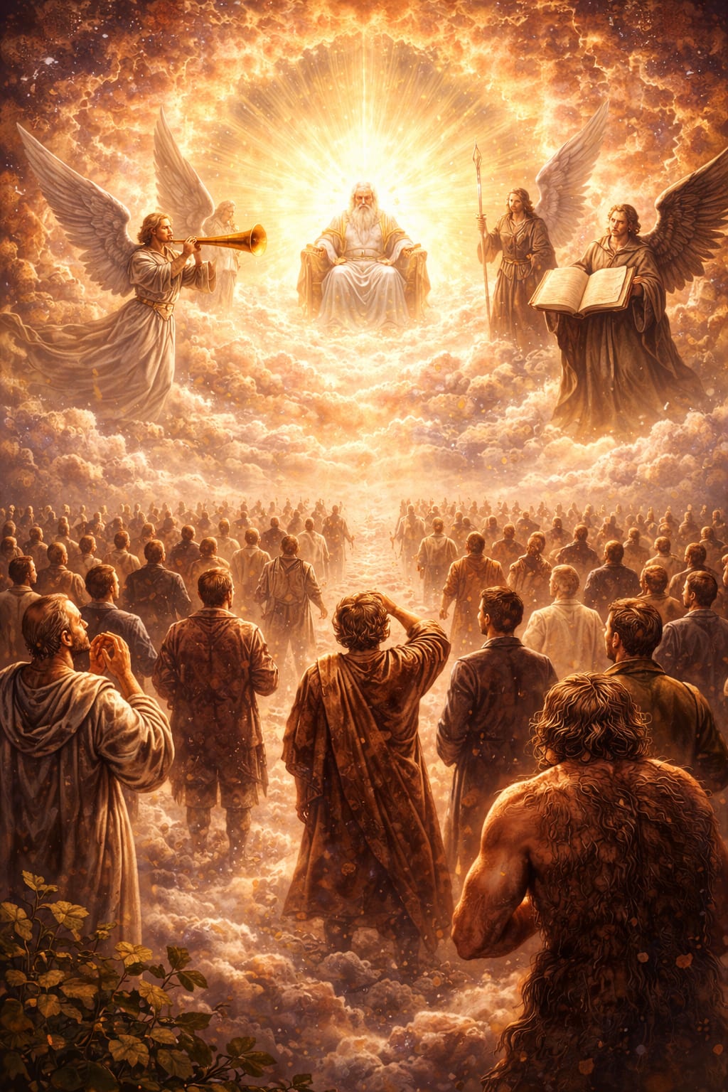 The final blast seemed to hook me and pull me upward. In an instant I was no longer in my grave. My small monument, the old elm tree nearby, and the quiet sea view vanished like smoke. Instead, I found myself standing in a vast open space filled with countless people—men, women, children from every age and nation. The place was enormous, stretching like an amphitheater beneath a sky brighter than day. Before us, seated upon a throne of dazzling white cloud, was God Himself, surrounded by angels. One angel still held a great trumpet. Another stood with a massive book in his hands.