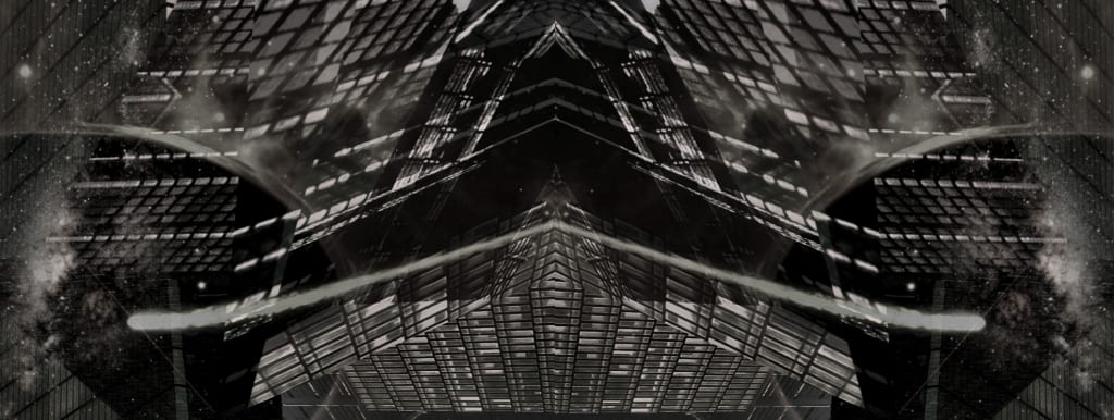 The spacecraft occupied the volumetric center of the universe-sized hangar – levitating in place above the acres of concrete floor like an upended monolith of heretofore unencountered scale – an inverse Abaddon but no less inspirational of fear and trembling. The ship was prismoid and rectilinear and stretched horizontally to such a length that the far end touched a vanishing point beyond Rhodes’ eyeline. It was wrapped in monumental and mesomorphic sinews of glass and steel running with monstrous curvature to form a hull with planes of shimmering and reflective brilliance beset upon by reptiliform columns twisting with disquiet in an impregnable and hibernal embrace.