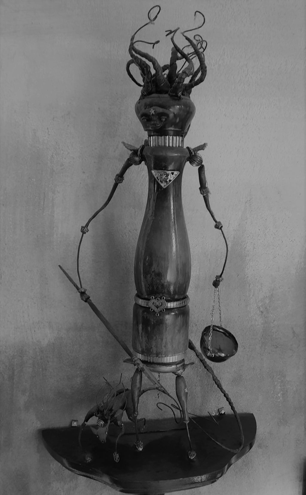 The King of Dirt is rather small, not what you would think a king in size should be. The King’s body is an old pepper mill—a wooden one. The King of Dirt has wild hair of thick locks which spiral straight up in upside down tornados. His face is pinched clay and meme alien. His eyes black glass beads, and his arm and legs spindly, long, and made of clock wire. In one hand the King hold a pen quill, in the other a tea-strainer painted to look full of ink. From the place where pepper should pour hangs a chain so you know this is a king and not a queen, as the wings on his back may confuse you because of eons of gender fairy tale brainwashing.