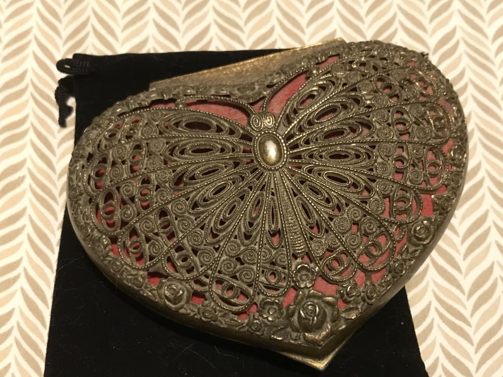 He turned it over and felt with his fingers and noticed a hinge. “It opens, see.” He used his ragged thumb nail to pry open the heart-shaped locket. There was a rolled up paper inside.