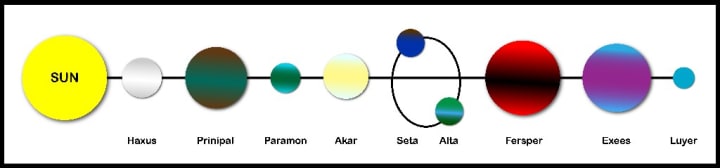 Seta and Alta form a binary star network, orbiting eachother in lockstep as they orbit the sun. Due to this, the two planets have a strange day/night cycle. Seta is a mostly ocean planet with few rocky islands on the surface. The underwater ecosystem is very diverse and studied by several underwater research stations. It’s also home to an expansive tourism industry. Alta contains a very wet Earth-like atmosphere. Colonies have been established here as well as residence for Seta tourists.