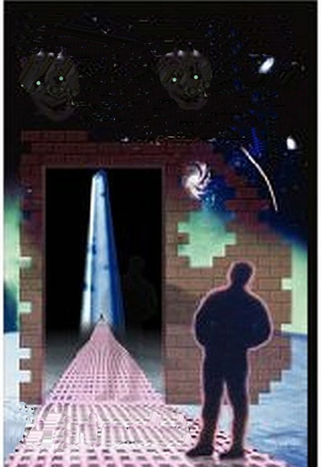 ...At the end of the glowing lattice across void, Charlie faces the iridescent, skyscraper crystal. He is dwarfed to minuscule proportions. Behind him, the lattice stretches back to infinity where, somewhere is a brick facade with a door that sucks like a vacuum. The castle-like crystal has a triangle door that admits Charlie with no resistance. His proportion-sense, already confused, fails him.