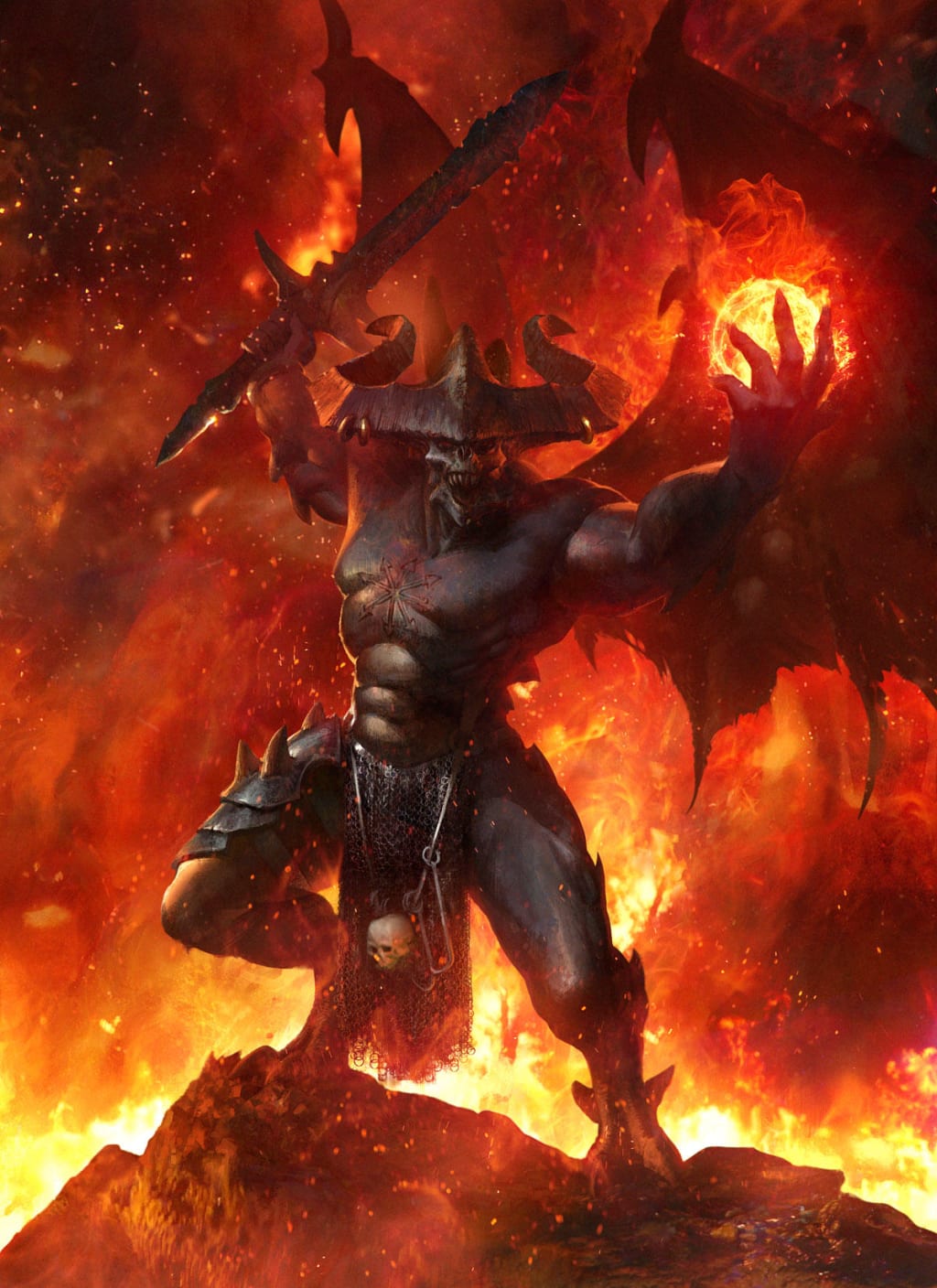 There He was. Abaddon himself, King of this plane of hell. Wreathed in smoke and flames, what little of his body could be seen made it clear that he was terrifyingly huge-he could crush me underneath his feet if he so chose. Demons know no fear, and yet seeing this beast that promised death brought terror to my soul. He was seated atop a massive throne of skeletons and corpses in various states of decay that filled the entire top of this cursed mountain. Every instinct screamed to run, but something about His deadly gaze kept me rooted in place. His skin was dark red, almost black with rough scales and his face looked like a twisted combination of dragon, goat and wolf.