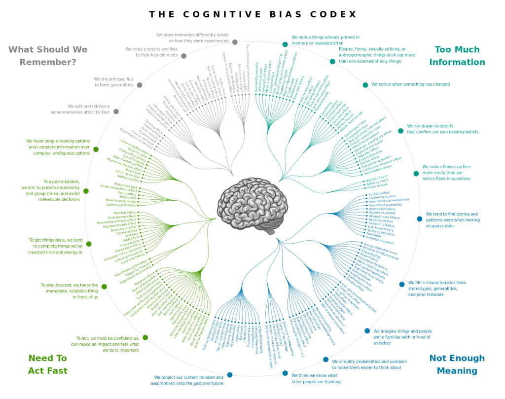 Donnie was a disciple and apostle for the church of cognitive biases. In fact, the very first thing Donnie ever said to Thomas, only moments after meeting him for the very first time and introducing himself, was "You can't help, or, when necessary hurt, yourself or other people, if you do not understand cognitive biases. You must study them, committ them to memory, come to know them like the back of your hand, ruthlessly seek them out in yourself and others, and, when found, do everything in your power to eliminate them, or use them to your advantage." Back then Thomas only had a vague idea of what a cognitive bias even was and dismissed Donnie as a raving lunatic, though there was something about him and the way he spoke with such authority and conviction that eventually drew him into his small circle of friends. Donnie had taken his study of cognitive biases to a level well beyond what even the most dedicated psychologist or behavioral scientist ever had. At all times he carried with him a well worn and heavily anotated copy of the cognitive bias codex. The codex itself is essentially a visual representation of all 250 plus known cognitive biases. Donnie had modified the codex with his own system of notes and observations which he had compiled into a several inches thick notebook. Thomas had never seen Donnie without that notebook and imagined that he probably slept with it under his pillow at night, though he never did work up the guts to ask Donnie that. At various times he had called the codex, "The Bible", the "The keys to humanity", "The tree of human understanding", and "Wittgenstein's wardrobe". That last one Thomas had not even begun to understand. Then again, nobody likely could understand, as Donnie also happened to be one of the foremost (non-academic) scholars of the great logician/philosopher of mind and language, Ludwig Wittgenstein, or so he liked to say. And, as usual, Thomas and just about everybody else believed him when he said it. His writings on Wittgenstein were strikingly original and thought provoking, but Thomas was in no position to judge exactly how other Wittgenstein scholars might view them. However, he was generally inclined to give Donnie the benefit of the doubt no matter what he said because, unlike most other intellectuals he had ever known, Donnie was almost always right, almost. What Thomas genuinely appreciated about Donnie was that, in contrast to most other blowhards, when he was wrong, he was the first to admit it. Whenever he was found to be mistaken about something he liked to say that "It is impossible for anyone to be correct all the time, but by studying and understanding cognitive biases and always applying the scientific method we can rectify our errors, and atone for them." More often than not, when Donnie was wrong about something, he was the first to discover it, and he made sure everybody knew he had been wrong and why. He was harder on himself than anyone else, mostly because there were so few who ever did or could challenge him on just about anything he said. To most people, the errors he had made and would describe in conversation were just as non-intelligeble as the original assertion about which he was confessing he was wrong. His intellect was impressive, but he was not omniscient, and he knew it, and was never afraid to admit it. "If we fear what we do not know, we will never know anything." was yet another of Donnie's trademark pithy sayings, and it was one Thomas very much tried to take to heart.