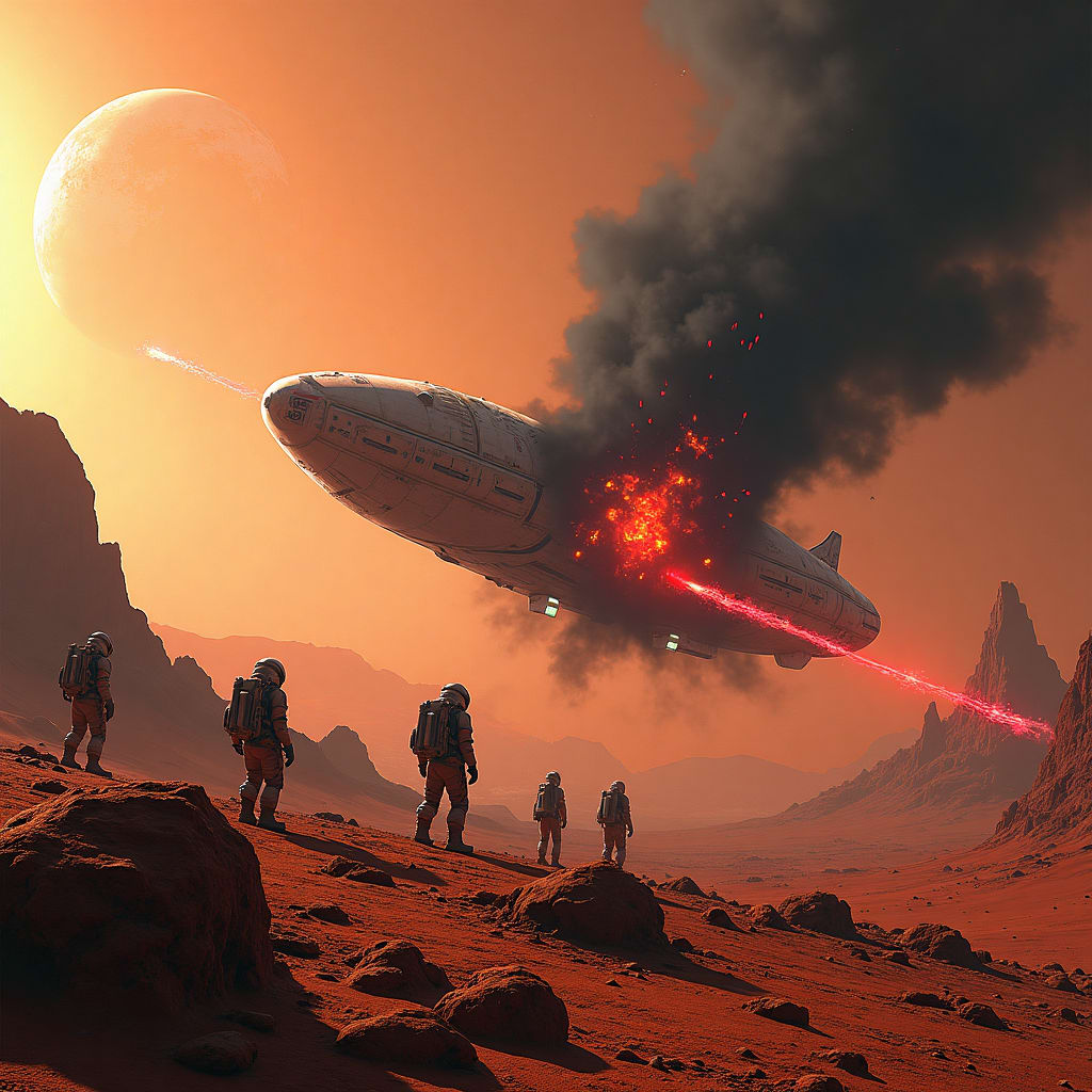 The red planet loomed in the viewport, a desolate expanse of dust and jagged stone lit faintly by a dying sun. For the crew of the Odyssey, this mission to Sector Nine-Tau was meant to be routine—an exploratory survey of mineral deposits. Instead, they found the Aeternum, a ship missing for over a century, silently orbiting the planet like a tomb.