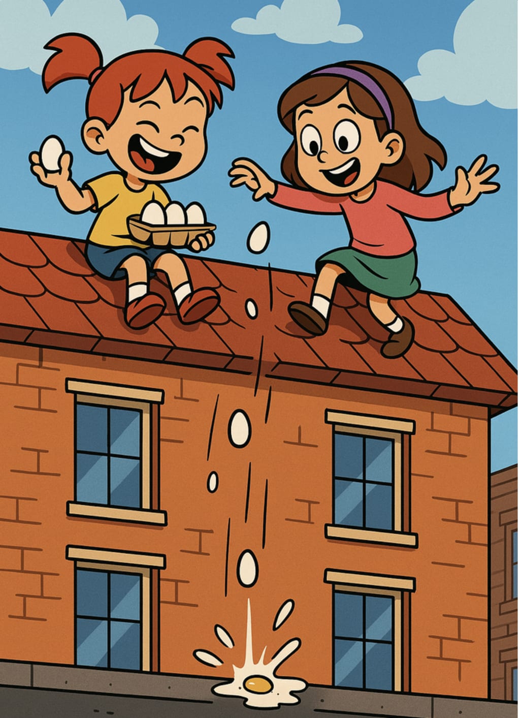 Two little girls were sitting on a roof of a three-story building, busy with a competition for target practice. They were throwing eggs at the pedestrians on the street.