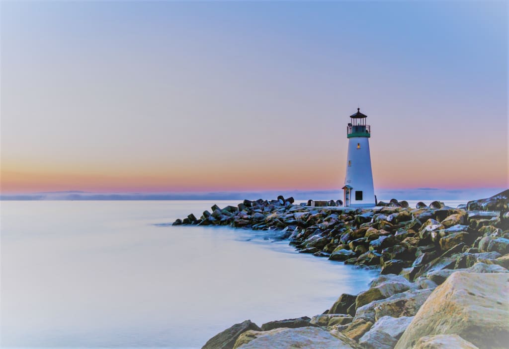 Another twenty minutes passing, until finally, Sam lays eyes on what they’ve been searching for. A high-spirited laugh of happiness coming from her chest as she stops to admire the beautiful sight at the fore, the lighthouse from her vivid dreams standing tall and untouched within a cove off the ocean, surrounded by stones of rainbow. Its tower off-white and upper-level green, with a solid-gold top, which explains the shimmering, she thinks, eyeing each window for any movement inside.
