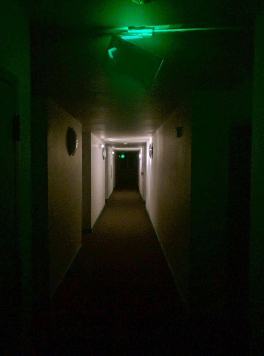 Beyond the door was dim, only scattered green lights to what appeared to be exit signs were visible and some faint flickering fluorescents that seemed to be dying. Making the hall feel long and oppressive, there were no traces of life in the musty hall, at the end there seemed to be an endless stairwell. Gadge had no intention of wasting time being curious with the other rooms on this floor, and he moved cautiously and quickly towards the stairwell. Following the greenlights to guide him out.