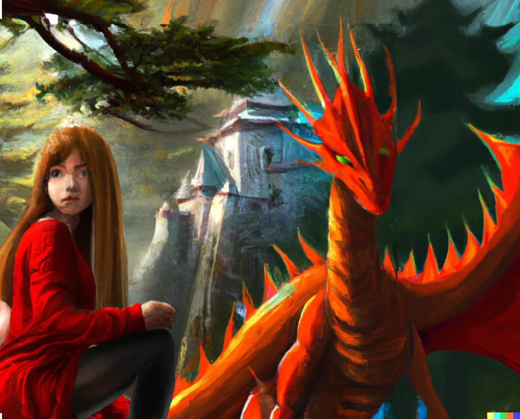 "I do not have food with me, but if you would like, I can take you to some food." She nodded, almost shyly, and I extended a hand to her. She climbed up and sat in the middle of my palm and I rose on my hindlegs and took to the sky. Gold and ruby colors dripped from the clouds as we flew back towards my home. A bit of the ruins of the castle rose above the treeline. We landed nearby and I carried her to the once neatly kept orchard and we picked fruits until the stars twinkled through the leaves above us. She curled up and was soon asleep as the giant sapphire moon lit the world around us. I walked, twigs cracking and leaves rustling, back to the ruins I called my home. I laid her carefully on one of the still standing couches in the grand hall and went out into the night to gather fallen branches. These I snapped down to size, carrying them beneath the crumbling archway and putting them into the fireplace to start a fire.