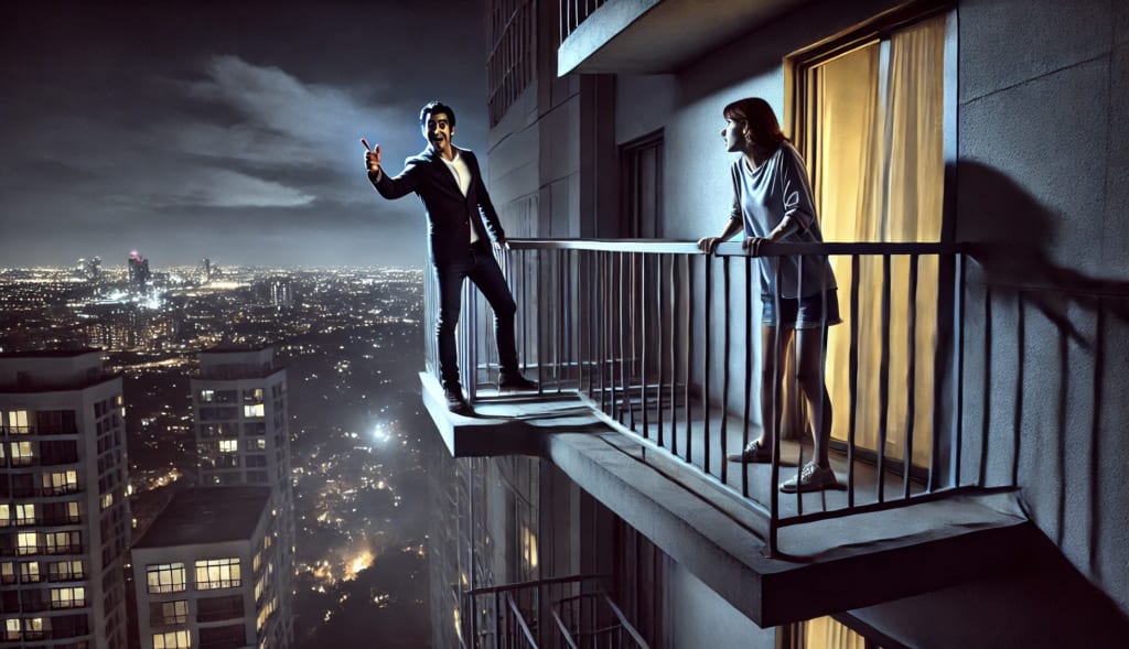 A man answers the doorbell in his high-rise building apartment and sees his beautiful neighbor, clearly distressed.