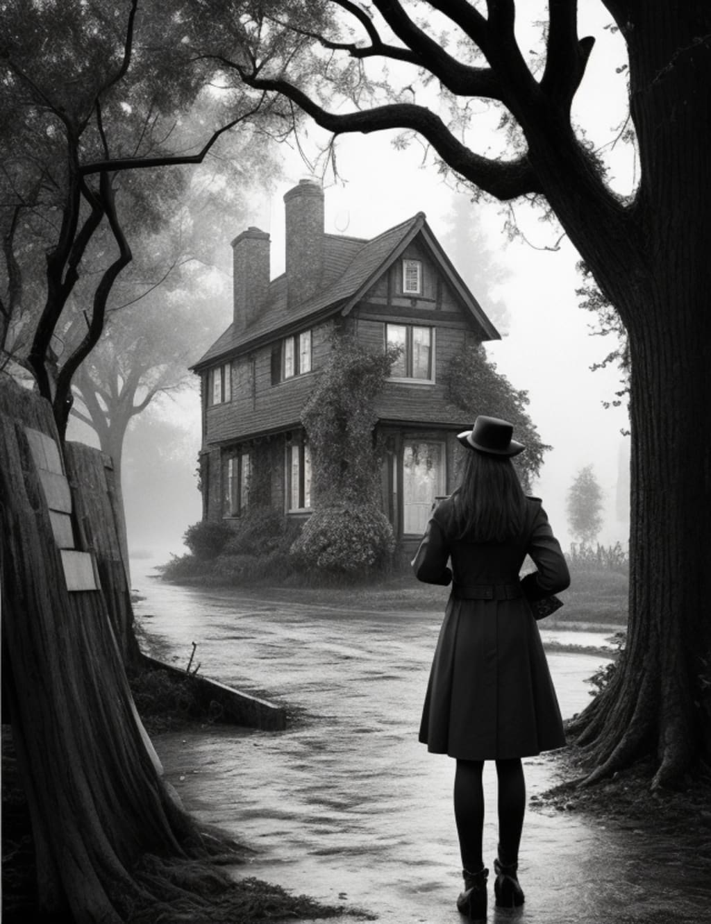 It was a cold, dreary night in the small town of Willowbrook. The rain fell in heavy sheets, drenching the deserted streets. In the heart of the town, nestled between old oaks and eerie mist, stood a peculiar house. Its windows were boarded up, and ivy had taken over the decaying walls. The townsfolk believed it to be haunted, and they called it "The Abandoned Manor."