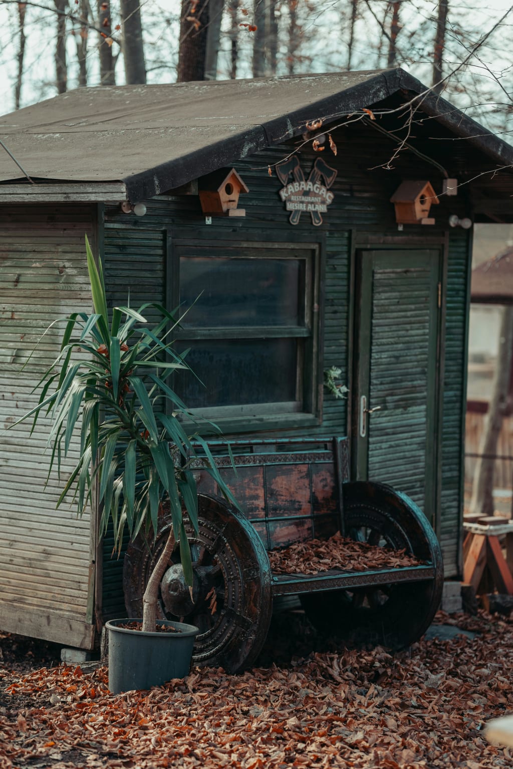 I believe that this little old shed belongs or belonged to someone who did like their solitude but liked nature so much that he decided to join it, but the way it looks with leaves all around piling up, but for even knowing that it is probably late autumn where is the owner. The sign above the door is kind of advertising for a restaurant could this little shed be a very small one or is the owner working or are they the owner or one the other hand it could just be a decoration for this little old shed.