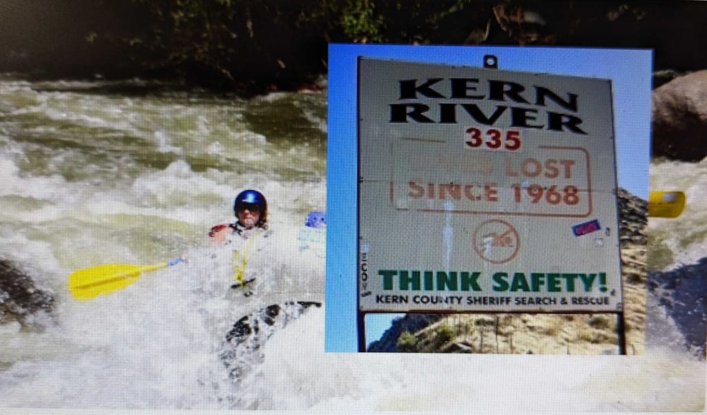 The deadly Kern. The subject of tragic news stories. I’m trying to forget that as we laugh and sing on our drive. But I see the sign anyway, the ominous sign enumerating deaths on the river. We drive by quickly but see 330-something. They’re not joking.