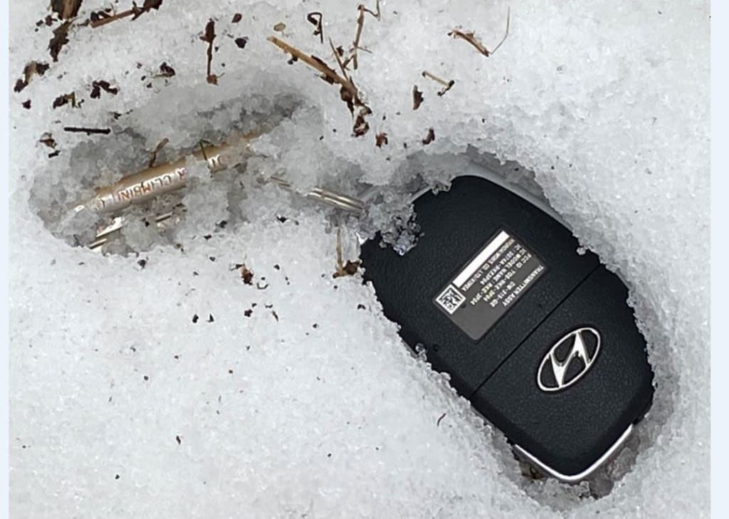 I feel sorry for the car key. Those electronic components won't last long in this weather. Me, I'll slowly rust, but I'm made of brass, so it'll take a while. But one of the duplicates she got is steel, so I'm worried. This is not the first time she's lost her keys, but this may be the most disastrous.