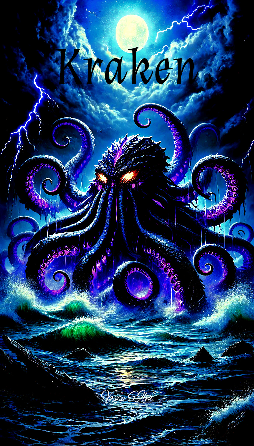 It was a monstrous creature, unlike anything that had ever swum through the seas. Its body was a deep, unnatural purple, pulsating with dark energy as it rose from the abyss. Massive tentacles unfurled from its body, each one thick as the ancient trees that once ruled the land, lined with sharp, barbed suckers. Its vast, bulbous head was crowned with jagged spines, and glowing yellow eyes peered out from its grotesque form. As it moved, its tentacles left trails of inky blackness, staining the water with an aura of malevolence. The Kraken’s maw opened, revealing rows of jagged teeth that seemed to stretch endlessly into the darkness.
