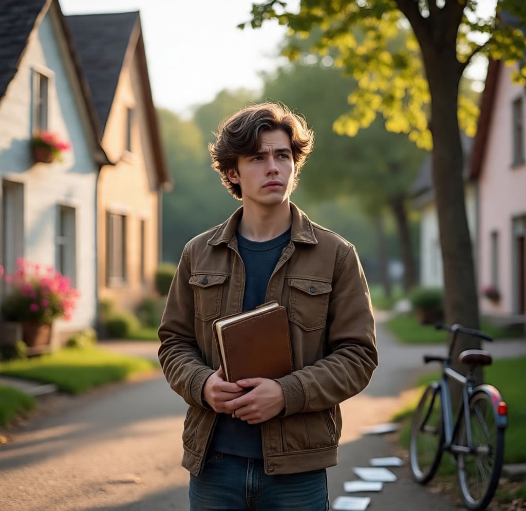 Curiosity tugged at him. He opened it. Inside were sketches, notes, and fragments of words. Some pages had pictures of a small town by a river 🌊, a bicycle leaning against a tree 🌳, a child laughing under a rainy sky 🌧️. His own handwriting stared back at him—familiar yet distant.