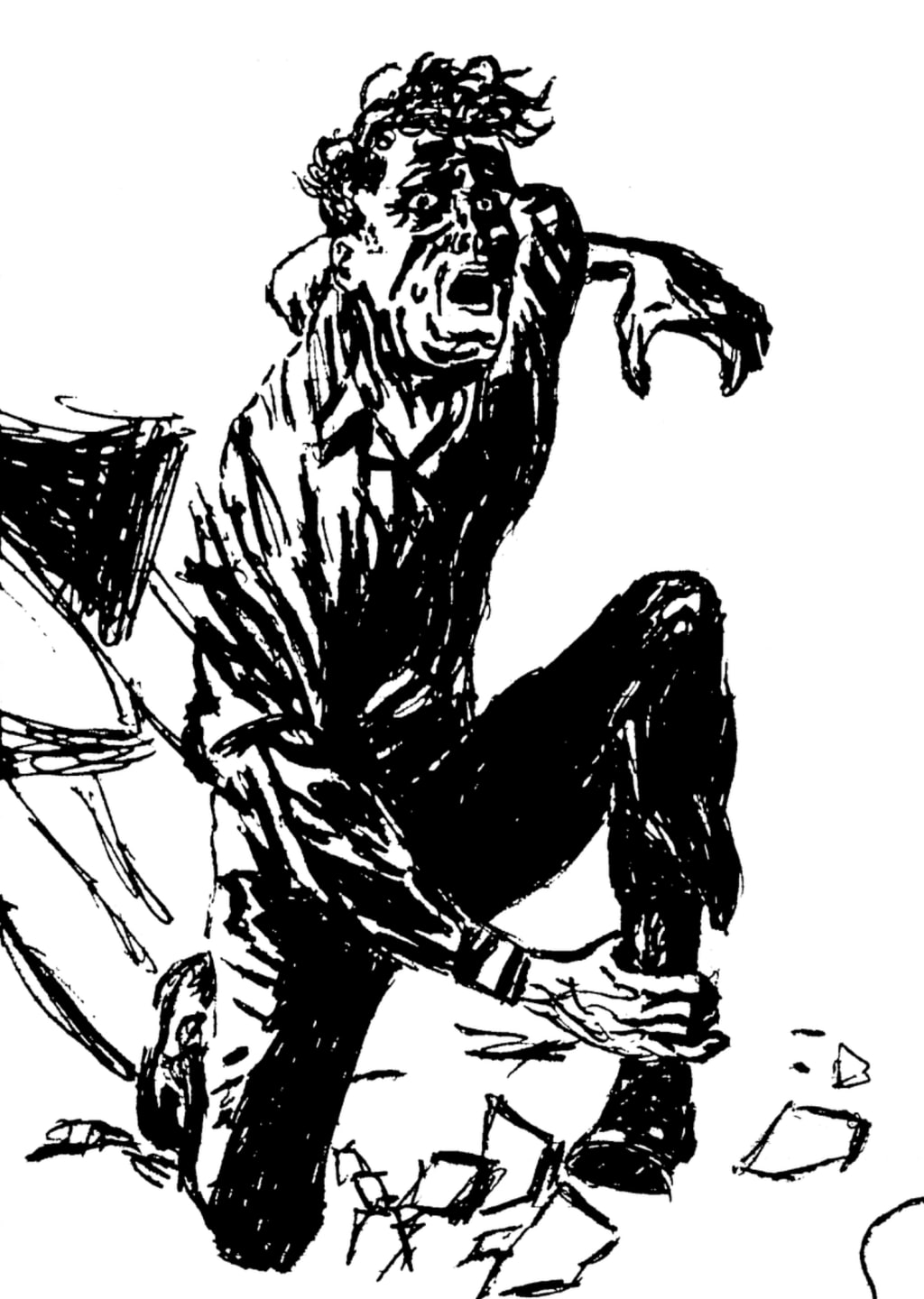 He falls, staring into her eyes, hand reaching towards her, pleading.