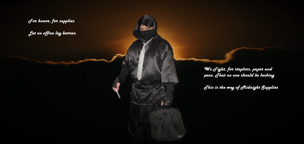 Midnight Supplies heard of his mission and found it to be noble and worthy. The chosen one pledged his loyalty to them and in return they did the same. On that day the Office Ninja was born. His first mission was to develop an underground network to get supplies to those in need.