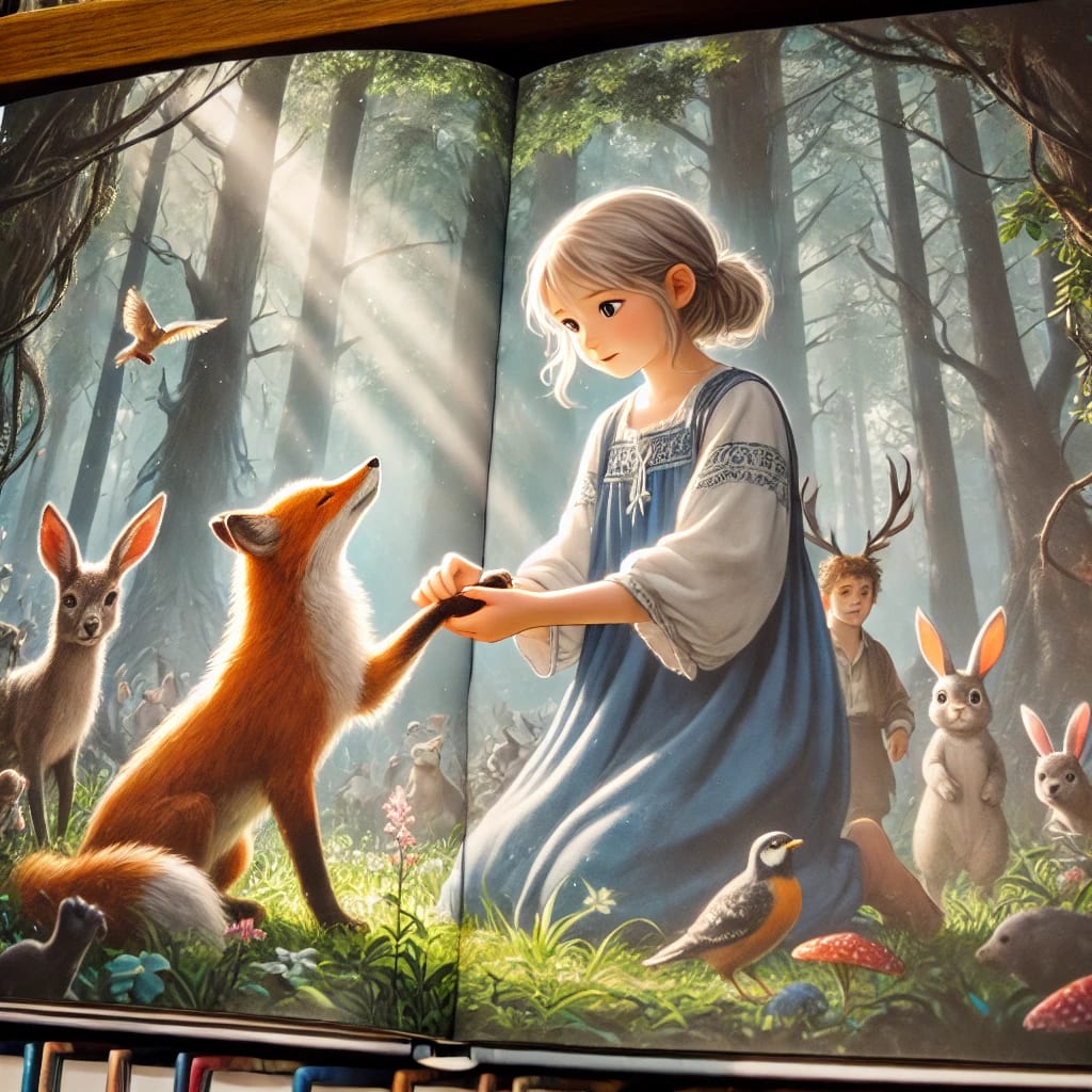 One day, while walking deeper into the woods than usual, Mira stumbled upon a small, injured fox. The fox's paw was caught in a trap, and it looked up at her with pleading eyes. Without hesitation, Mira gently freed the fox and bandaged its paw with a piece of her dress.