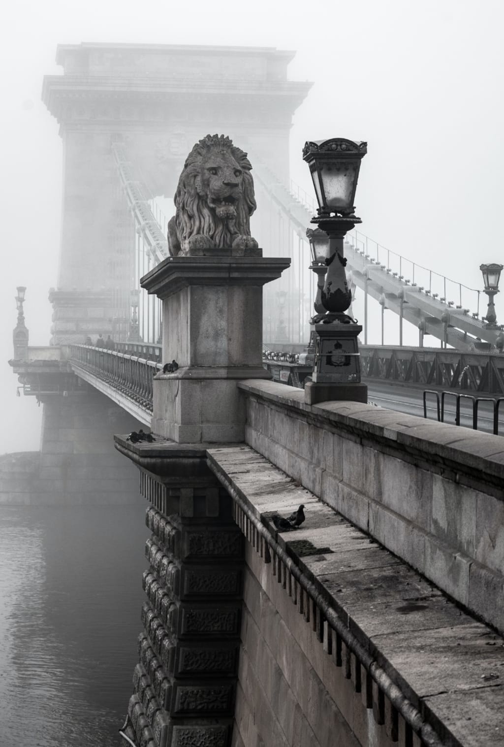 It was around seven in the evening. The sun lingered on the horizon, its ochre seeping a bloody haze over the Danube. Their first stop was the Chain Bridge, at each end of which stood two majestic grey lions, each made of cast iron. In the dusk, the bridge appeared to be suspended in the water.