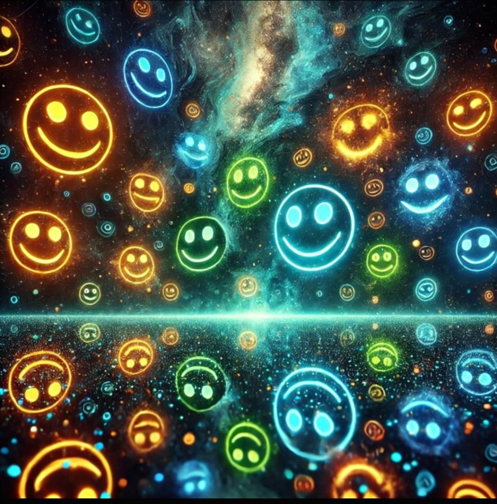 This surreal image illustrates the profound duality of human emotions. Set against an infinite cosmic backdrop, the floating neon smiles—both joyful and distorted—represent the spectrum of feelings that coexist within us. The electric blues, greens, and oranges highlight a reflective atmosphere, urging viewers to ponder the complexity of happiness amidst the vastness of existence. The piece bridges beauty and melancholy, creating a deeply introspective visual narrative.