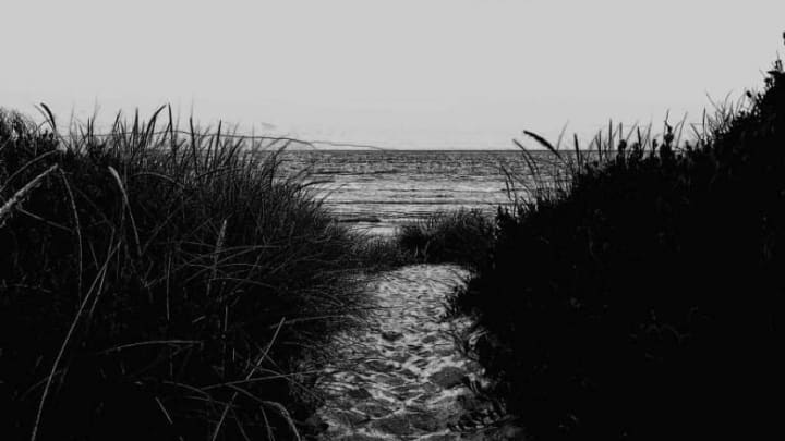 A story of a woman who sits in the dead of the night writing her last story. A writer who hears a sigh and is overcome with sensation and with dread. A woman who leaves her life’s work, her home, to walk out into the night, walk out through the shadows, walk over the dunes and down to the waters edge, the cold ocean lapping at her feet. Slowly she removes her clothes, letting them fall to the wet, crunchy sand, not noticing the waves pick them up and pull them out and away before she herself steps into the water, the spray and foam swirling up her legs and over her body as she walks.