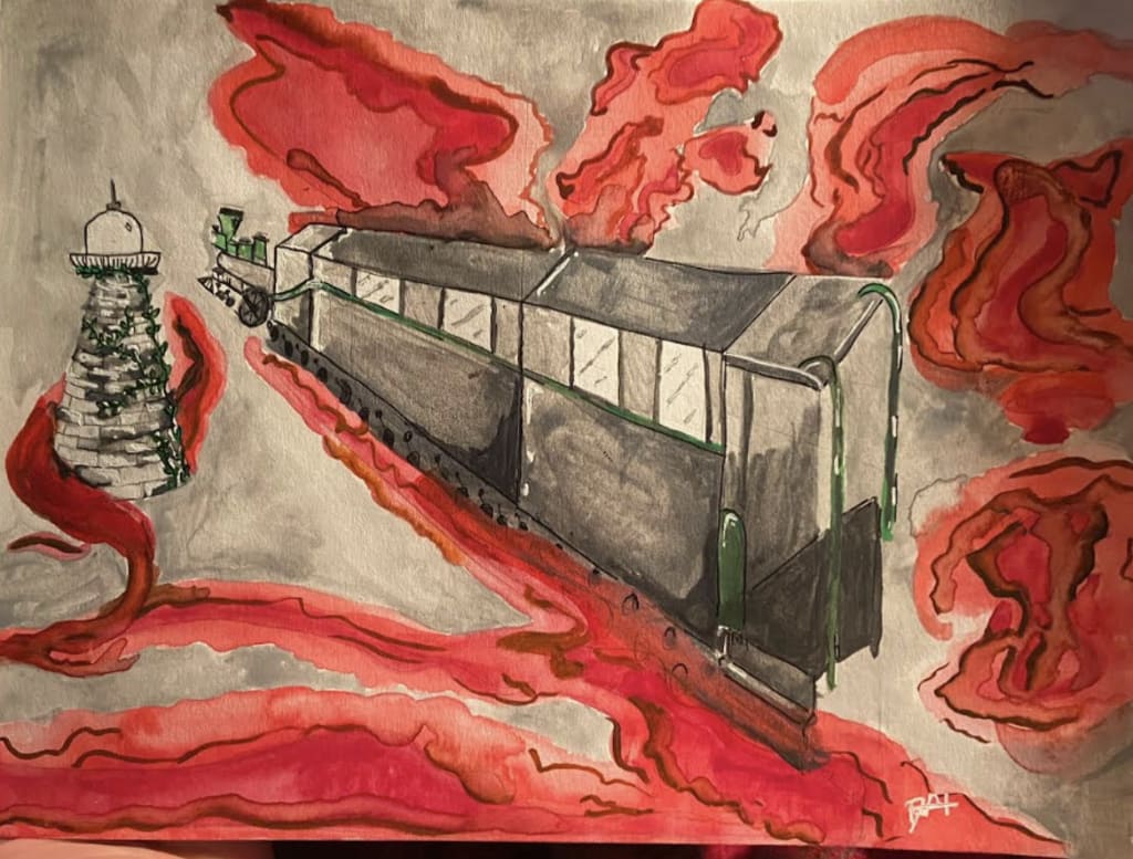 The lighthouse is solid white and beautiful greenery is starting to grow alongside it. Suddenly, a brilliant light fills the train. I am temporarily blinded, but I feel more at ease. As the light leaves, I realize that we are indeed floating. There is no evidence of the train being on rails, not even the sound of it. My head is now swarming with thoughts, and my mouth is eager to speak. I turn to the woman and ask, ‘How do we know each other?’