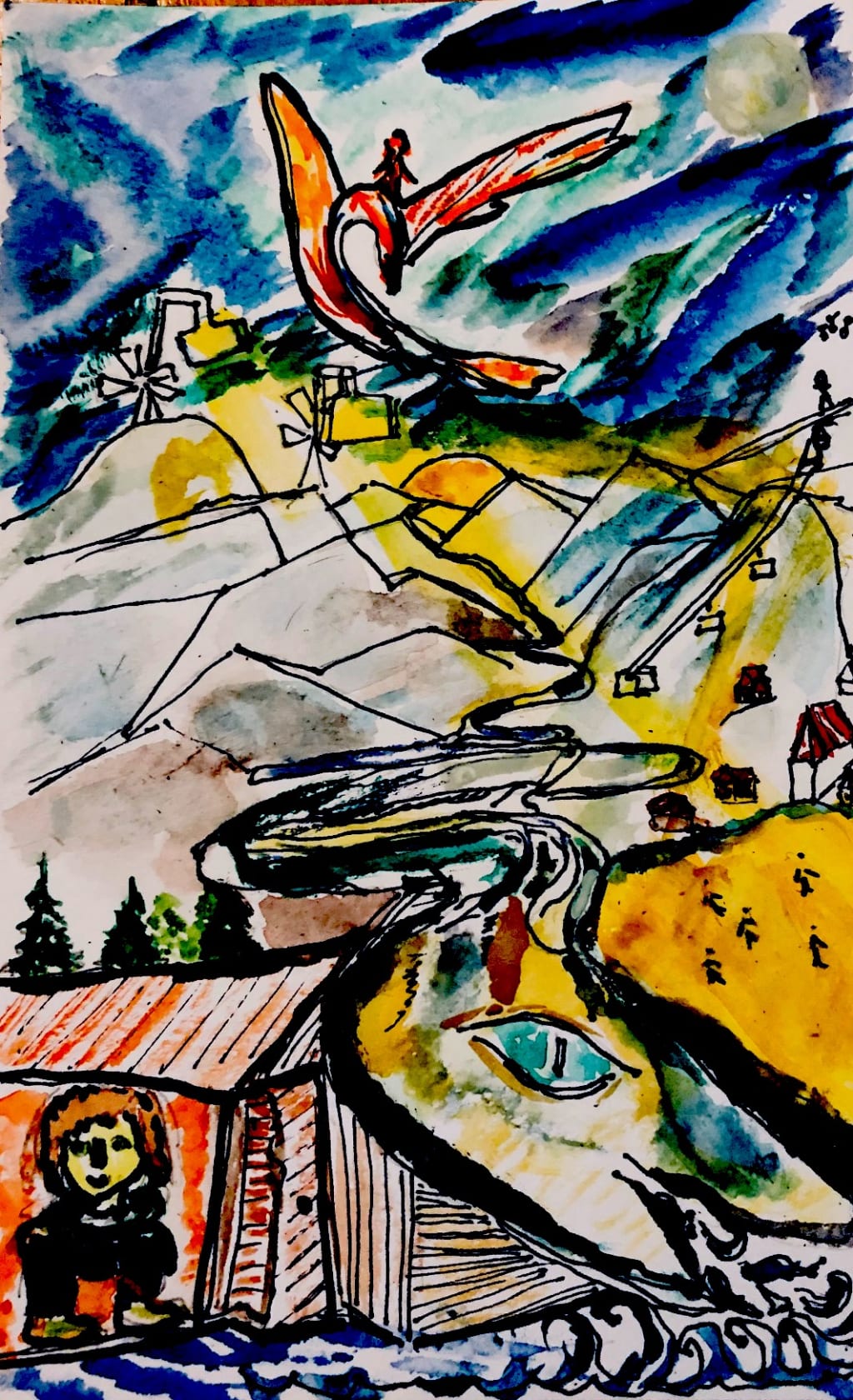 " The village people looked up surprised by what they heard, then they saw the sinking sun’s copper alpine glow and spontaneously generate light over the village square. They saw light that followed the dragon curve then saw Gallopatrot carried Golinda. They changed into the flaming phoenix, a multicoloured bird who could make beautiful music and bring serendipitous synchronicities that transformed the darkness into light.