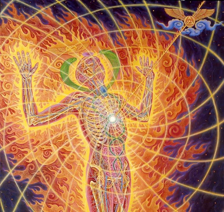 A sensation of bemusement crept up from the mycelial network that sensed the rhythmic footsteps of the human that began to lose himself in dance. This sensation crept up into the roots and then continued to be drawn up the immense trunk of the tree dispersing itself throughout the branches and leaves. As if cued up by the heavens at that moment a breeze drifted through, twisting and turning through the network of leaves creating a dance of their own. Auric fields merging the true being of the forest was revealed to the human and his dancing came to a halt. He stood jaw agape paralyzed by the glory of this revelation, As their auric fields merged like never before a divine line of communication opened up. Words were not uttered nor did they need be. For the man and the tree and all of the beings in the forest in this moment were One. Interconnected. All working sentient parts of the same body.