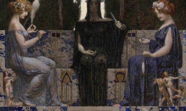 The host, Moros, expects the fresh entertainment to provide an exciting skit, a romance, or tragedy. Fate, however, interferes as she turns to Keres. A glint of metal at the throat of the female captures her attention.