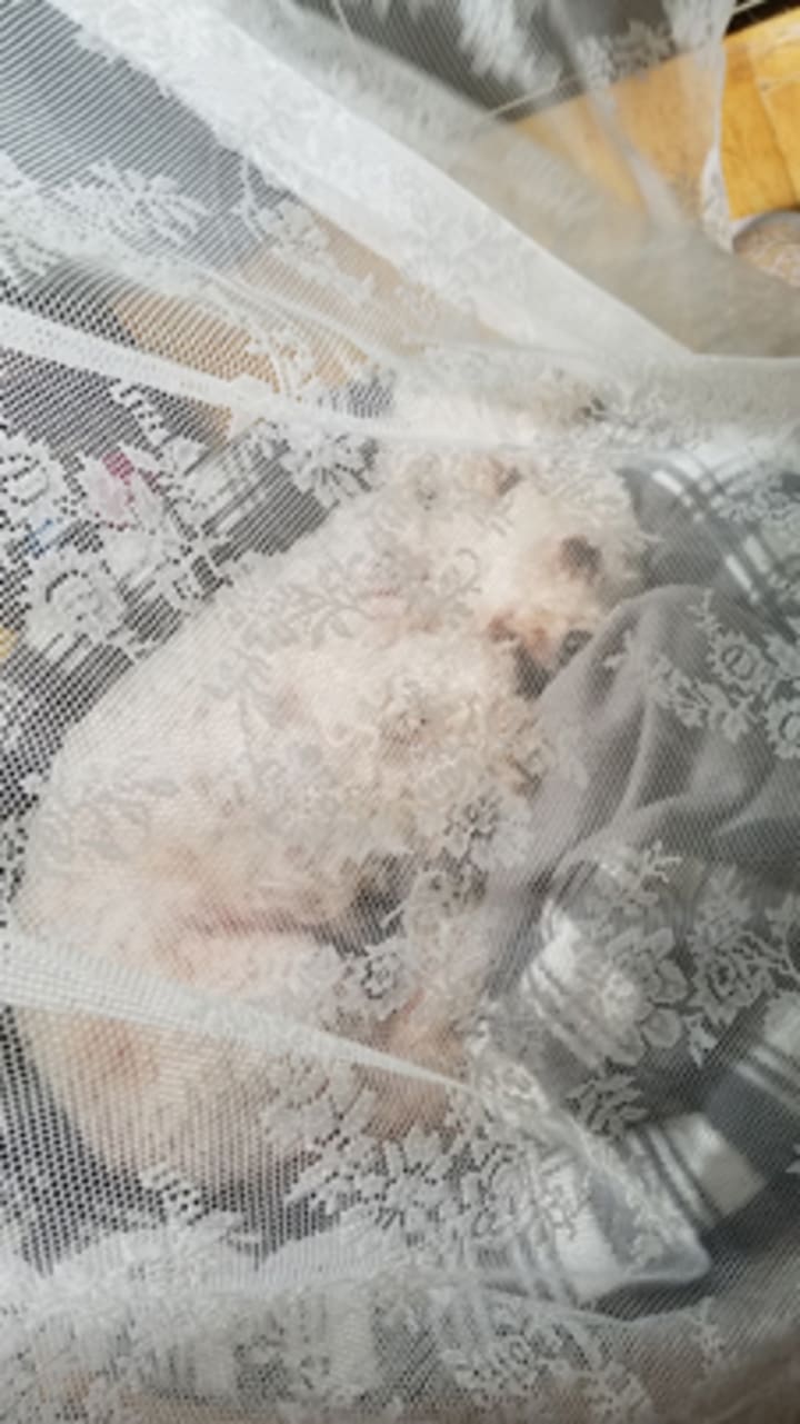 The breeze blew the lacy curtains over my sleeping doggy and made her look like a princess. She is the last survivor of three pups from the same litter we got almost 14 years ago. Practically blind, mostly deaf, with some bald spots starting, yet every moment with her is precious and we treat her like royalty.