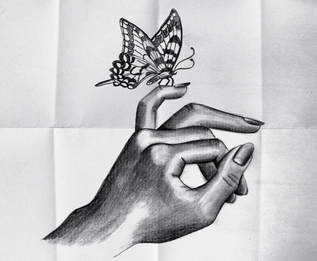 She lifted the hand further up, as if to touch the sun, and a butterfly sat on her pinky finger.