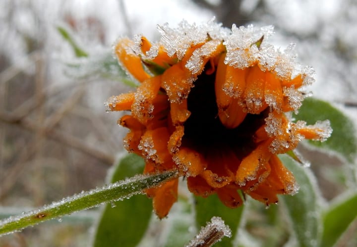 So, naturally, I looked down again. There, just at the edge beyond the guardrail, a single marigold blossom stood, petals frosted, disdainfully indifferent to the snow.