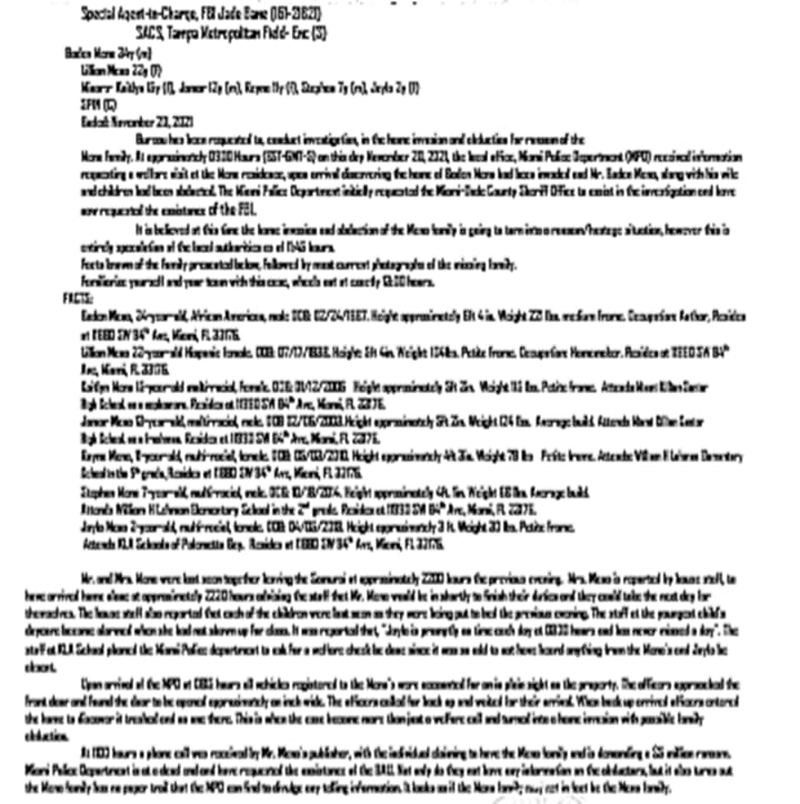 As she ran millions of potential scenarios through her head, she continued to look through the pictures, familiarizing herself with the crime scene. Every room looked to be poorly staged intended to direct the investigation into a burglary. This told Jade that whoever had done this did not fully think through the logistics of their plan. The part of the whole ordeal that Jade is having an issue with wrapping her mind around is how does an entire family exist in Miami, Florida, living a full life in 2021, and have absolutely no paper trail beyond school records for the kids, a deed on the house and registration on cars? She began to flip through the rest of the file, looking at the Mena’s pictures. One by one she flipped through them, etching every detail of this family into her mind.