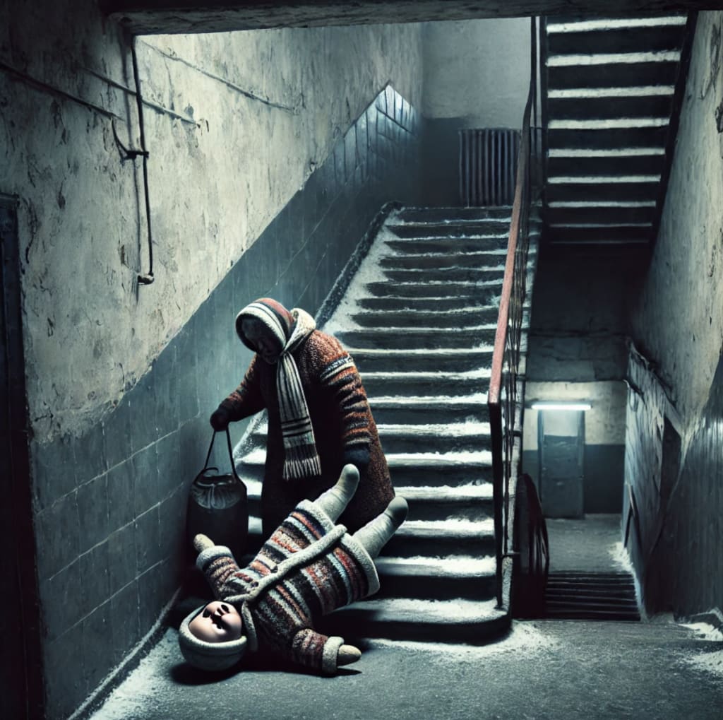 Picture the dead of the Siberian winter, when people bundle up and look like Russian nesting dolls. In a rundown high-rise apartment building, an old woman is dragging a little girl up the stairs, by the girl's foot, with the girl's head banging on the stairs.