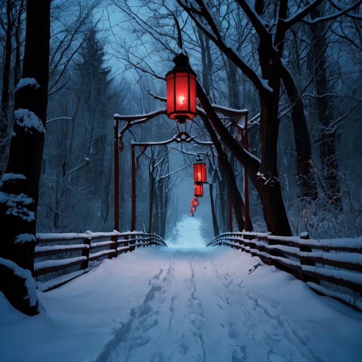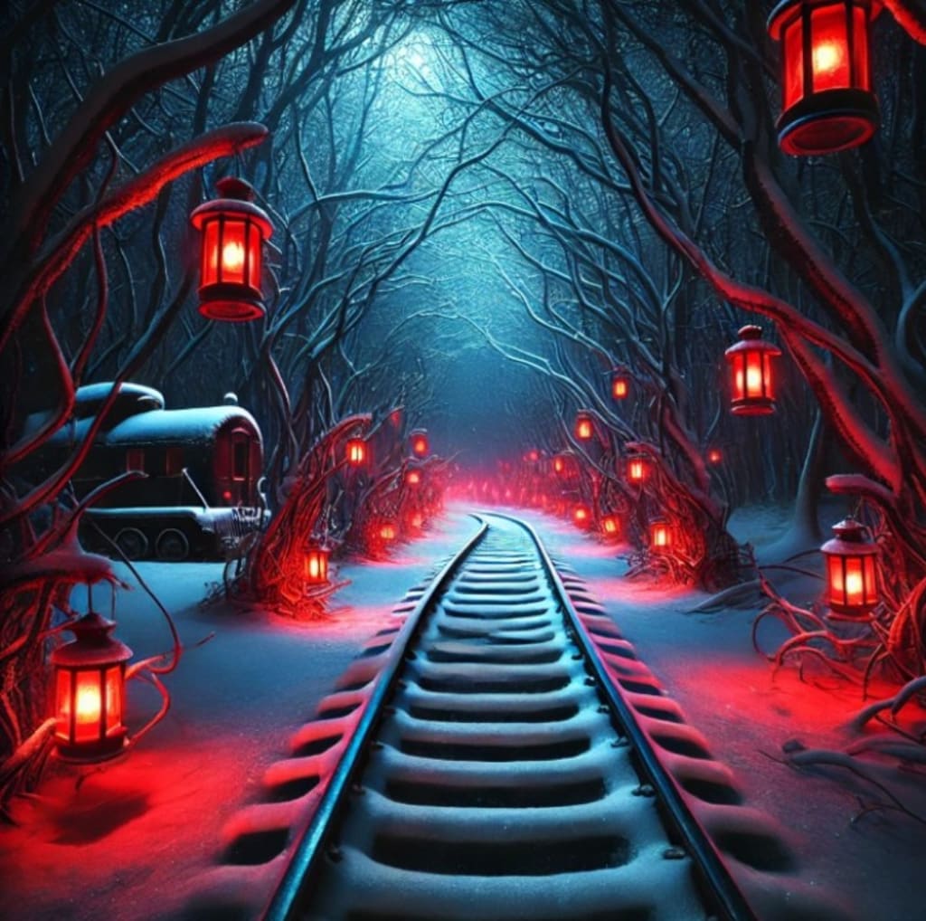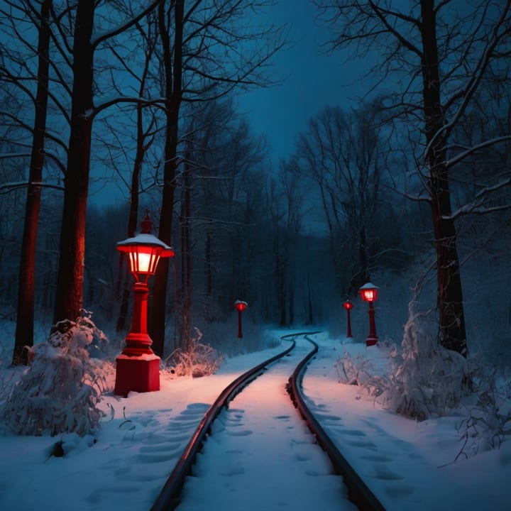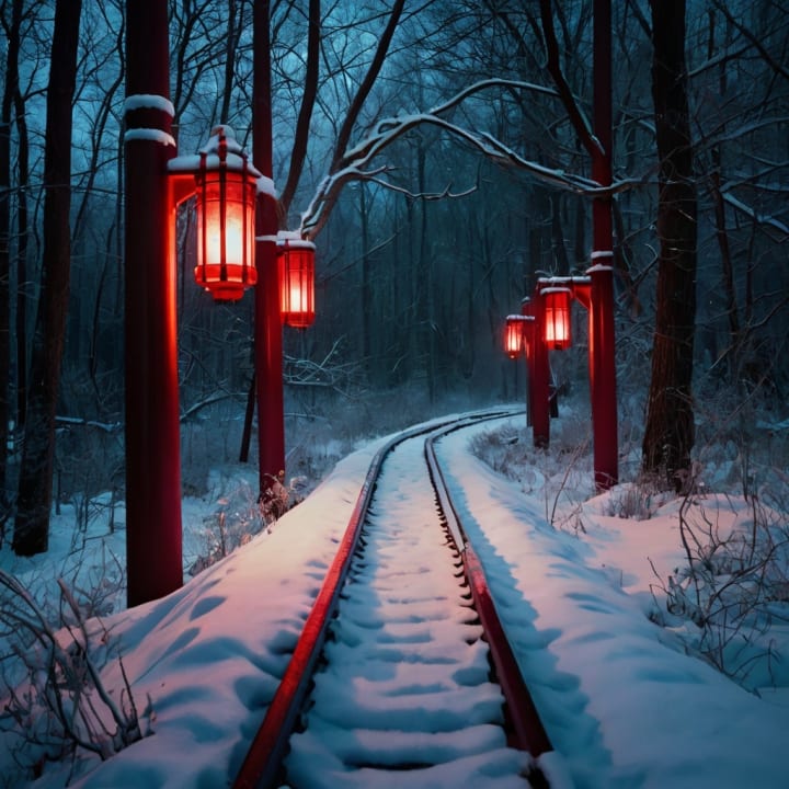 A hauntingly beautiful railway winding through a snow-blanketed forest, illuminated by glowing crimson lanterns. The eerie red light contrasts against the deep blue shadows of the winter night, creating an atmosphere of mystery and enchantment. The railway tracks, glowing faintly with the same red hue, seem to lead into the unknown, inviting those who dare to follow its path. The twisted, leafless trees add to the otherworldly ambiance, making it feel like a gateway to a realm beyond time.