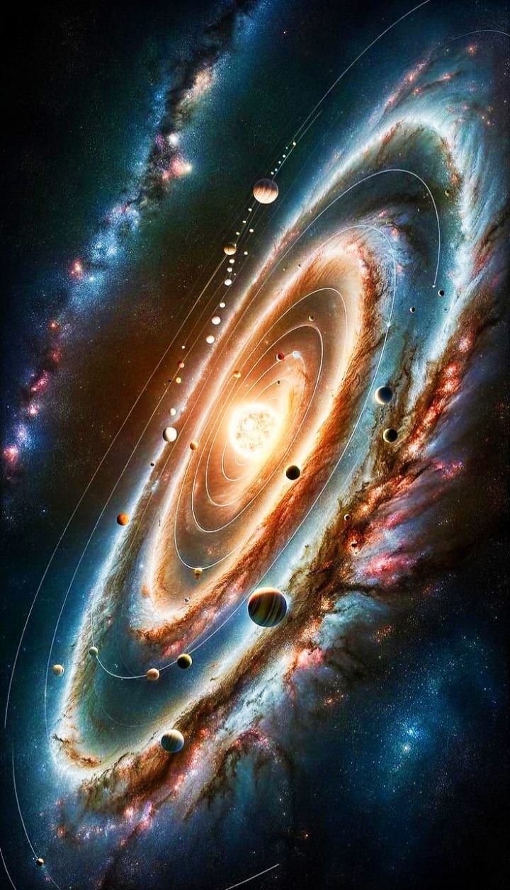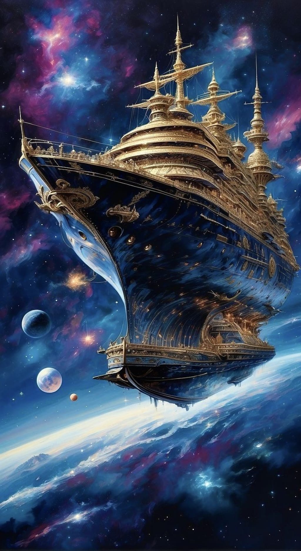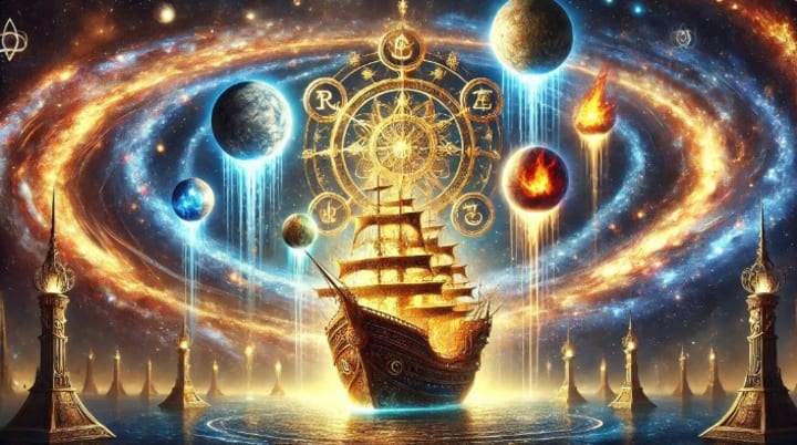 The golden celestial ship "Solaria’s Crown" sails through a vibrant spiral galaxy, surrounded by elemental planets radiating fire, water, earth, and air. Ethereal starlight guardians float nearby, guiding the ship toward a dreamlike planet shimmering with cascading prisms of light. The scene is a breathtaking blend of cosmic wonder and mythical grandeur.