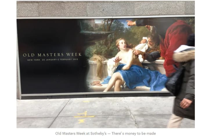Sotheby's likely had no idea what it was setting in motion when it chose to plaster the front of their gallery in New York City with a reproduction of Pompeo Gerolamo Batoni's take on the oft-painted and ever popular Bible story about Susanna and the Elders. The marketing poobahs probably thought that this was nothing more than the usual eye-catching promotion intended to let the deeper pockets passing in their sedans know what was coming up for auction soon.