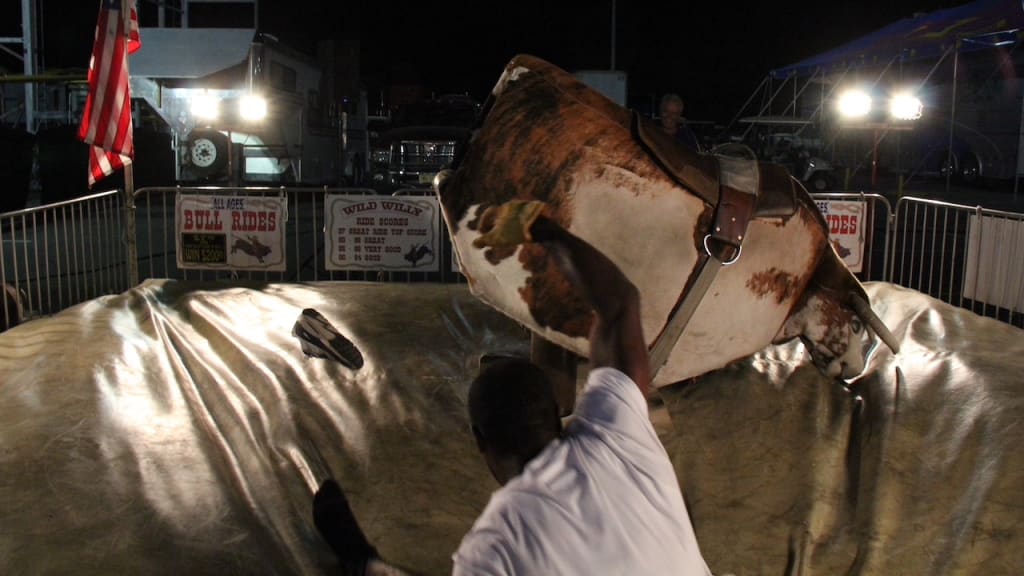 A second later, the mechanical bull bucked Alex off. He hurtled through the air with a “Whoo, boy!” then plopped down next to them.