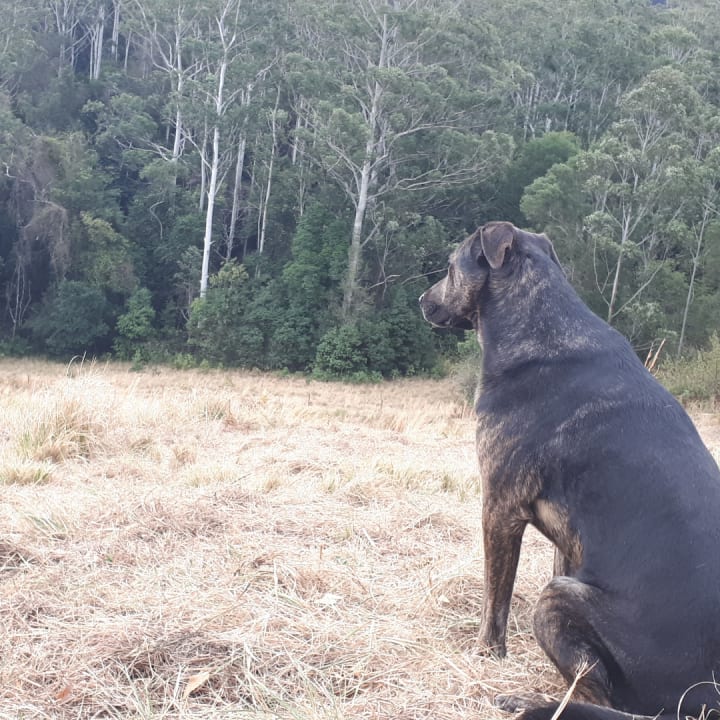 Living on the farm has kept you young, or so I tell people; there's salt and pepper on your muzzle where there used to be brindle but there's wisdom there too, the kind only dogs are privy too— smelling when the dingoes are about, knowing a kangaroo isn't worth the effort of the chase, how to make the best of rainy days on your veranda bed. And although the baby annoys you and you're less than enthusiastic about puppies visiting, I know it's me you'll look to when thunder rumbles and turns all 40kgs of you to jelly.