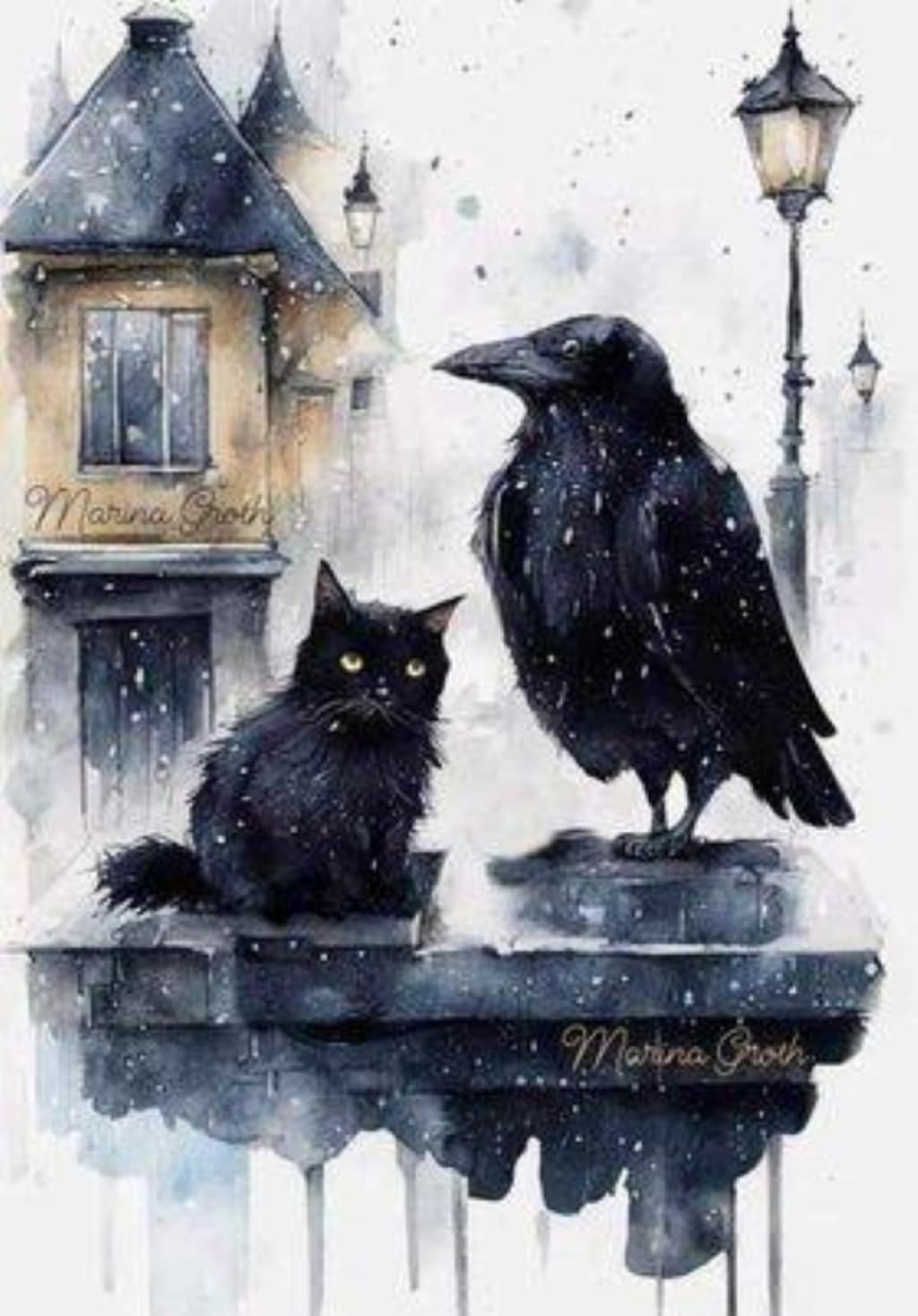 Snow was falling and it was cold but the black cat and the crow were together once again on the street pavement.