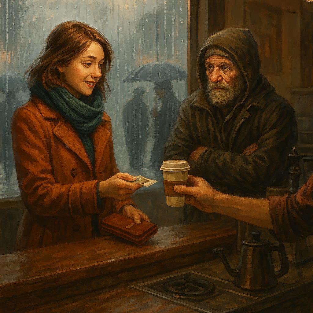 And then he left, stepping back into the rain with steam rising from the cup and maybe… a little warmth rising in his chest too.