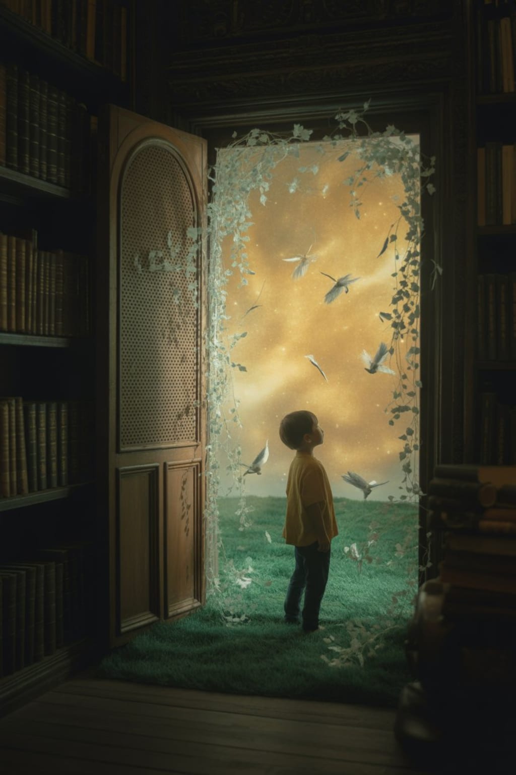 It wasn’t supposed to be there. Between two towering bookshelves stood a door. Not a normal one, but one that shimmered faintly, as though it was made of woven light. He blinked, rubbed his eyes, and looked again. The door was still there, glowing softly in the dim corner.
