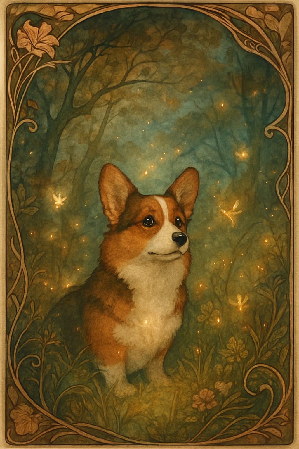 Here, the smells were sharper, untamed. Leaf mold and fox musk, mushroom spores and the metallic tang of a stream nearby. She followed her nose down a barely visible path, her corgi body close to the ground, tail a rudder guiding her through the unfamiliar terrain. The trees grew denser, their trunks twisted with age, bark furrowed like the faces of ancient beings frozen in slow contemplation.