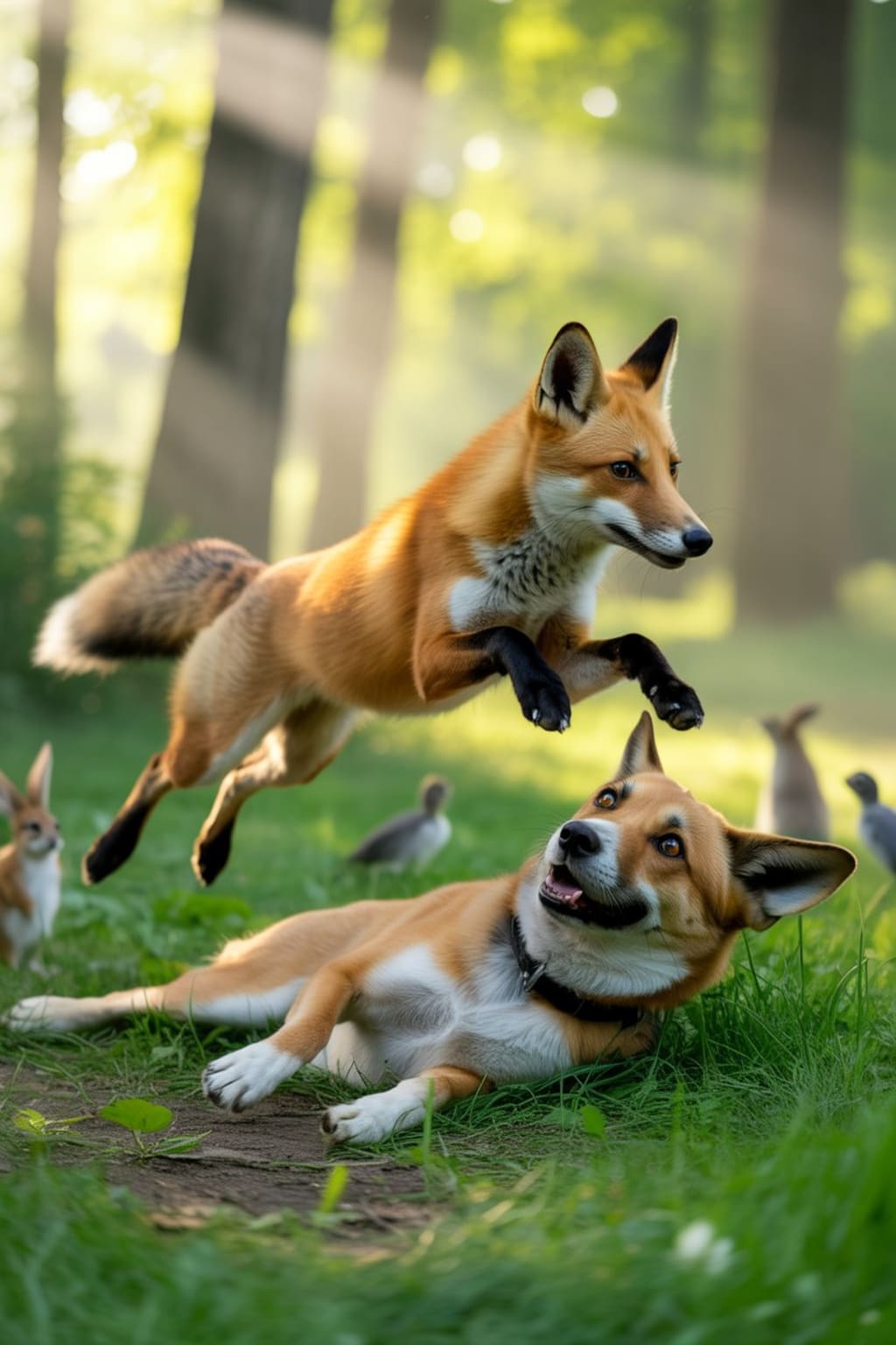 One morning, when the sun’s soft rays spread across the forest, the fox came hopping joyfully and saw the dog lying in his usual spot. With a mischievous smile, the fox said: