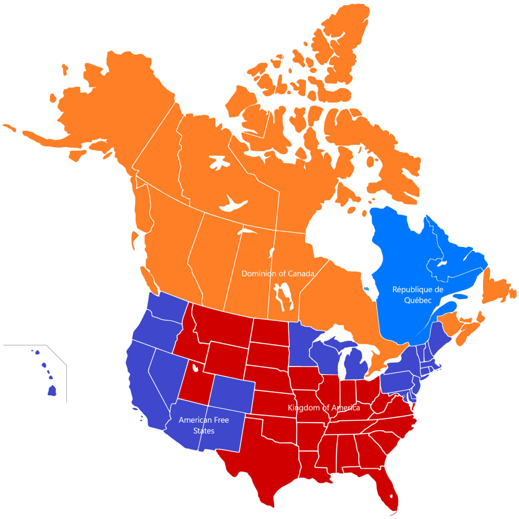 The state of Alaska was lost to the Dominion of Canada, due to unpaid debts the former Republic of the United States of America had towards its neighbor to the north. The USA had fucked up France in the past over unpaid war debts, which led to the French Revolution. Canada did not want to suffer the same fate. None of the two new countries wanted to take responsibility for those debts. And amid all this chaos, Québec became a republic, reclaiming Labrador on the way. Québec, as well as Canada, shut their borders with the Kingdom of America. Leaders from what were once considered South American banana republics were more than delighted over the chaos that reigned in the northern hemisphere.