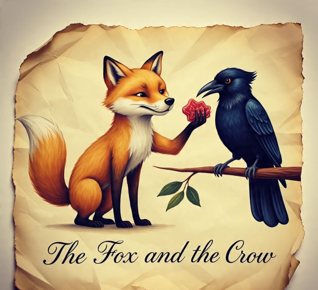 Midnight, flattered by the compliment, puffed out her chest. She loved being admired and appreciated. She opened her beak to sing, and as she did, the piece of cheese slipped out and fell towards the ground.