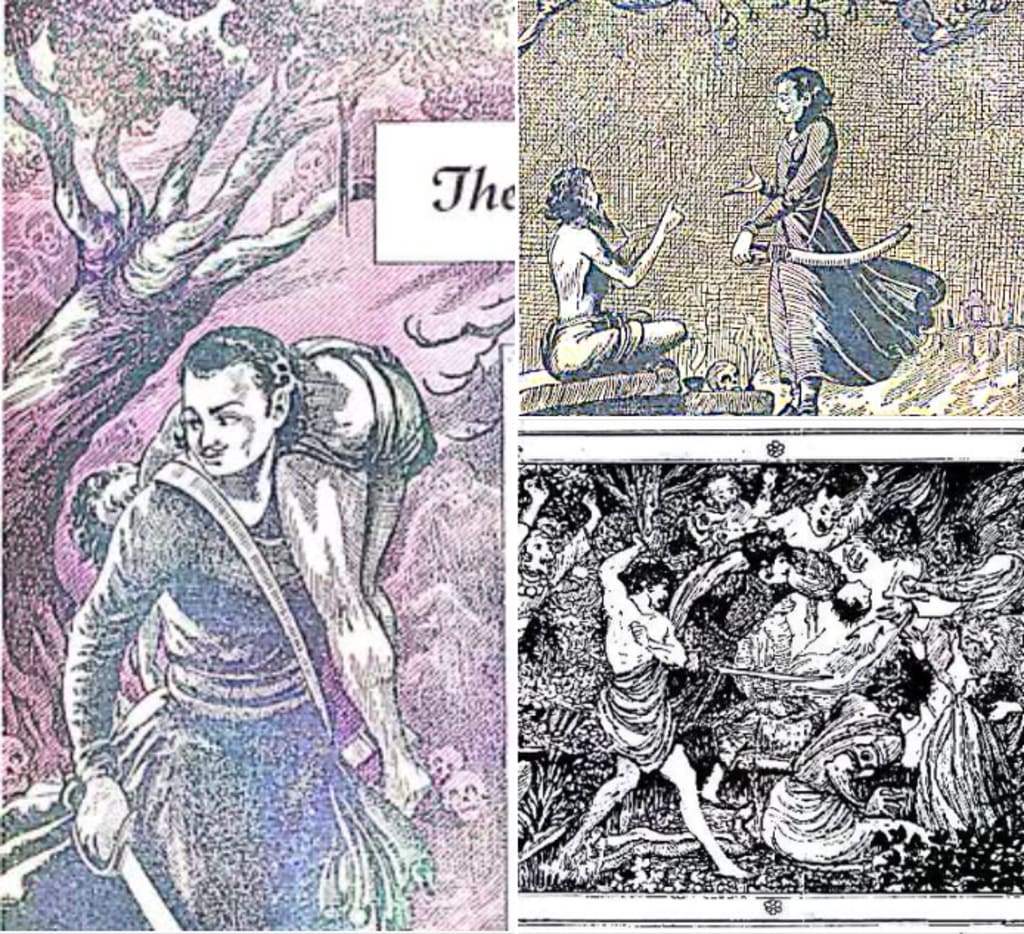 It was a horrible, dark night. Meanwhile, a torrential rain was pouring down. And all around him he could hear the sounds of corpses and ghosts whispering to one another, shouting. But he refused to stop and walked on, taking long strides. When snakes were biting his feet, the king was able to drive them away before they could bite him by reciting the mantras he had learned. In the end, the king