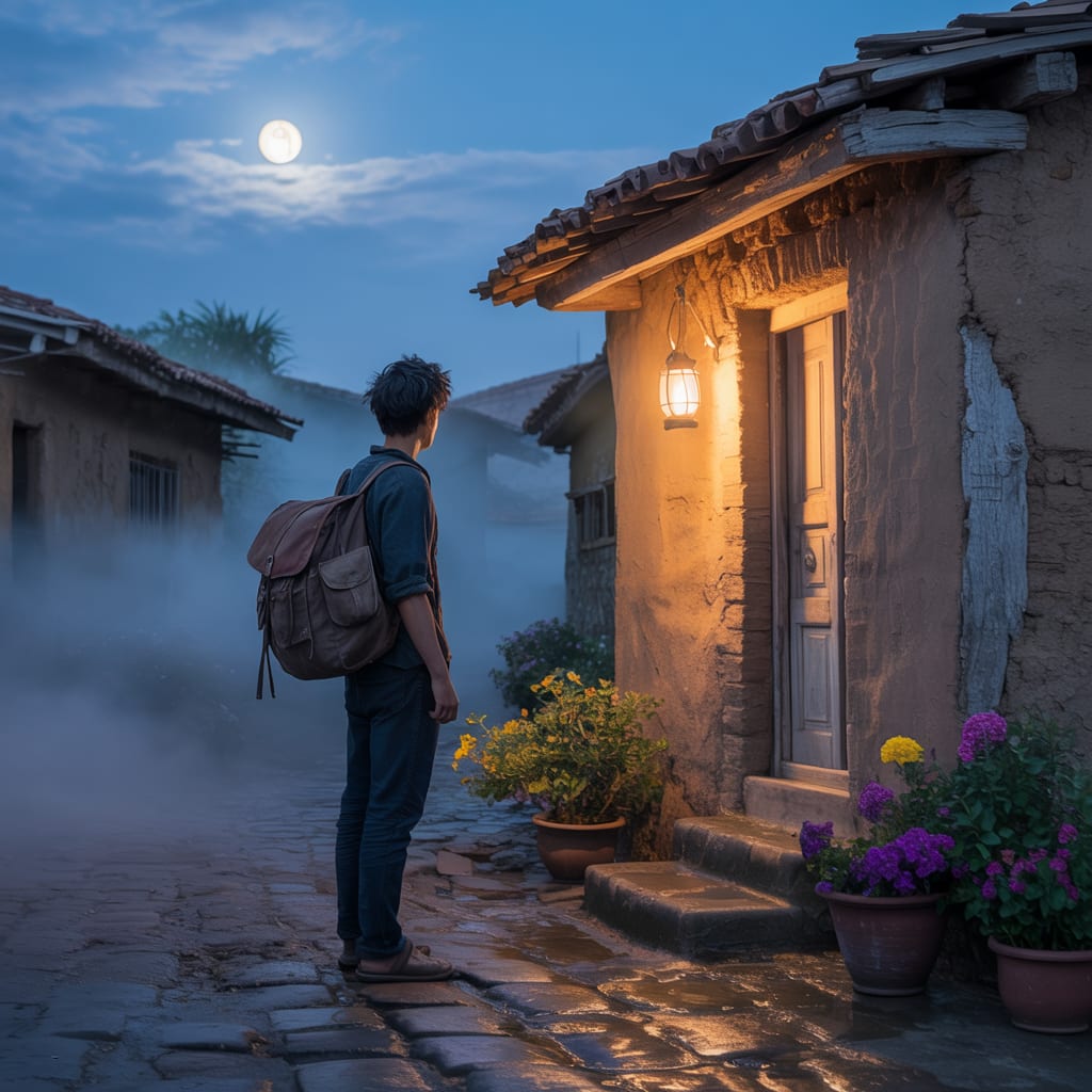 The old village slept beneath a veil of dust and silence. Houses made of clay stood shoulder to shoulder, breathing out the weight of years. The scent of earth and forgotten dreams floated in the still air. Every evening, as the sun sank behind the hills and shadows stretched across the narrow road, a single lantern came alive — hanging by the door of a small, crumbling house.