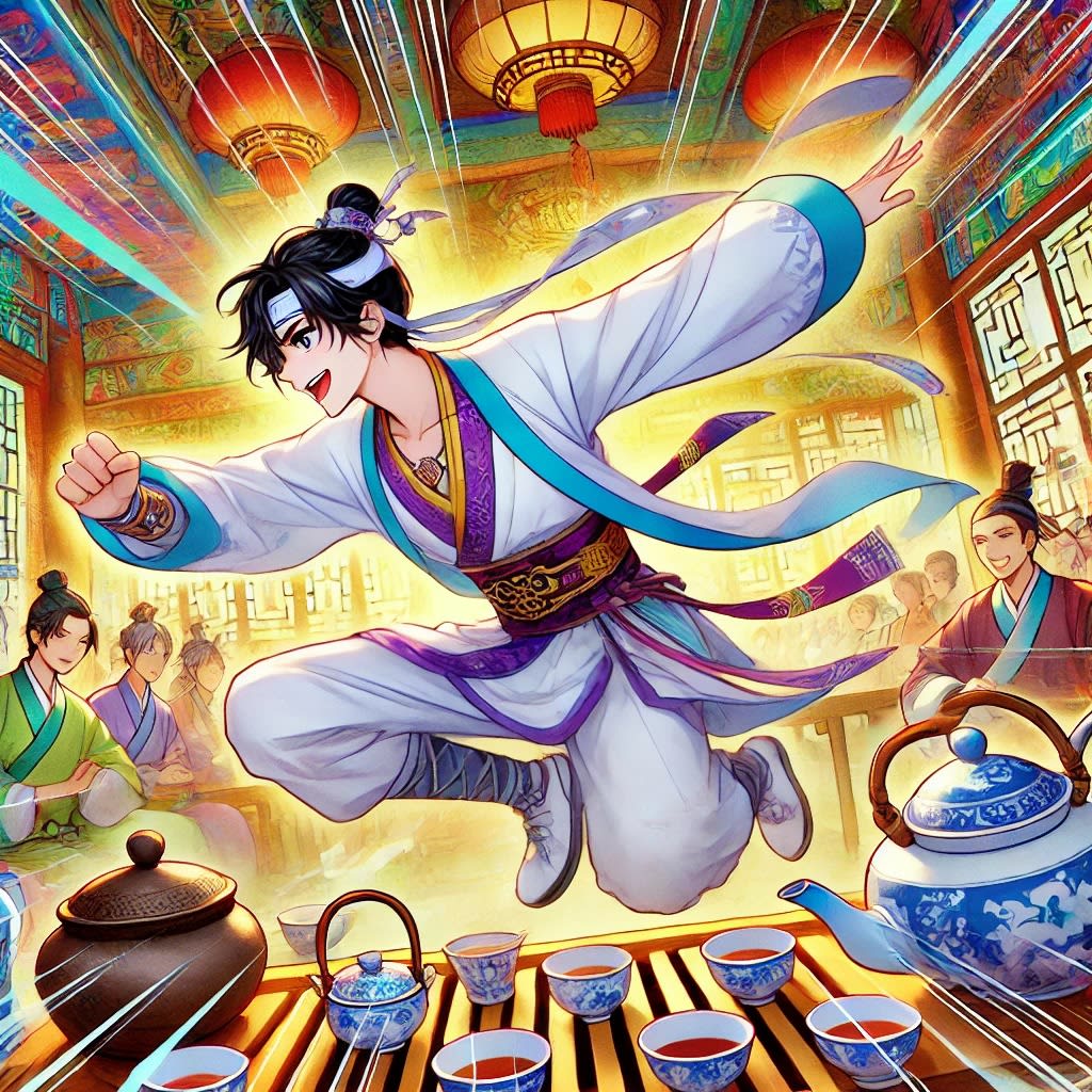 Step into the vibrant world of a young tea master, where the art of tea brewing is a dynamic spectacle. Set in a traditional tea house